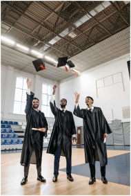 Three male graduates in gowns celebrate with cap t