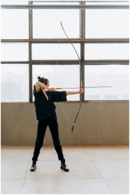 Woman practicing archery indoors, showcasing focus and skill with a bow and arrow.