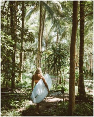 A young woman carries a surfboard through lush, sunlit jungle surroundings.