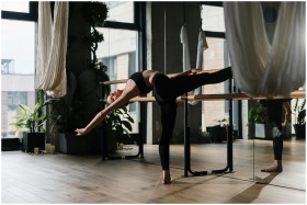 A woman stretches gracefully during a yoga session in a contemporary studio.
