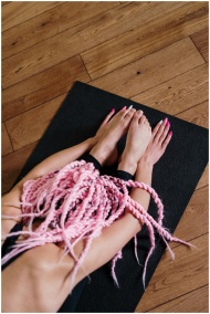 Woman in yoga pose with pink braids and nails on m