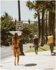 A woman in swimwear carries a surfboard on a sunny city street, capturing a vibrant urban lifestyle.