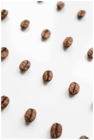 Artistic arrangement of coffee beans on a white ba