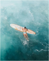 Woman surfing in clear blue ocean waters, showcasing a vibrant surf lifestyle.