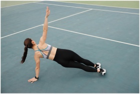 Woman in activewear doing a side plank on a tennis