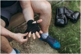 Man preparing for boxing training by wrapping hands outdoors, focusing on hand protection and technique.