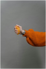 Hand squeezing an orange with juice dripping again