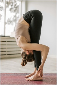 Woman performing a forward bend yoga pose indoors,