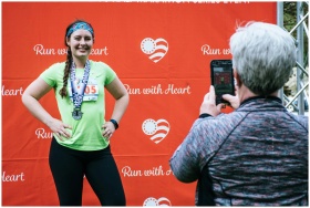 Woman posing with her medal after completing a 'Run with Heart' marathon event.