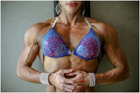 Strong female bodybuilder in blue rhinestone bikin