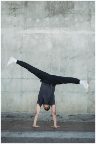 Full body anonymous flexible male in activewear performing handstand and doing split in air against shabby concrete wall