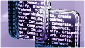 Abstract glass surfaces reflecting digital text cr