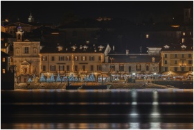 Beautiful riverside scene with holiday lights on b