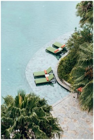 Relaxing poolside scene with lounge chairs and pal