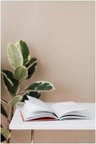 A minimalist scene with an open book on a table next to a ficus plant in natural daylight.
