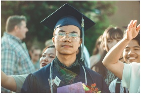 Asian male graduate smiling during an outdoor graduation celebration with family and friends.