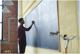 Man with dreadlocks writing on a blackboard in a classroom setting.
