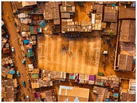 Aerial shot of an urban football field surrounded by dense housing in Accra, Ghana.