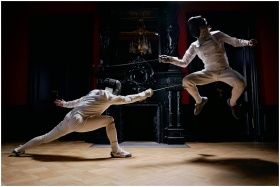 Two fencers engage in a dynamic duel, one leaping,