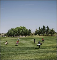 Golfers carrying bags on a lush green course under a clear blue sky.