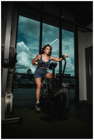A woman works out on a stationary bike indoors, promoting fitness and health.