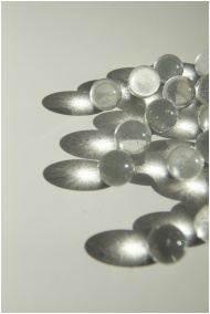 High angle of heap of small transparent glass balls scattered on white surface and shading in sunlight