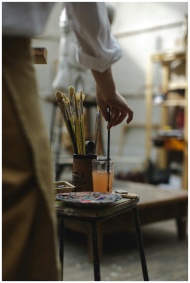 Artist mixing paints in a studio with brushes and