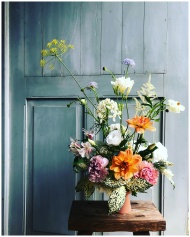 A vibrant floral bouquet in a vase displayed on a rustic wooden stool indoors.