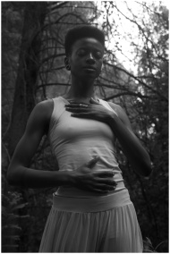 Black and white photo of a woman meditating in a serene forest, eyes closed.