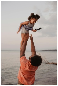 A joyful father lifts his daughter in the air by the beach during sunset, capturing a moment of love and happiness.