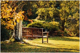Serene wooden bench surrounded by vibrant autumn foliage in a tranquil Kent park.