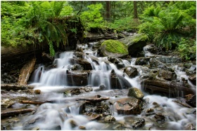 Peaceful waterfall cascading through lush forest, surrounded by mossy rocks and ferns.