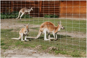 Group of red kangaroos in a zoo enclosure with visible fence.