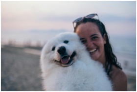 A joyful scene of a woman with sunglasses holding a white dog at a Vietnamese beach.