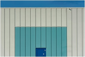 Abstract view of a minimalist building facade featuring a blue door and vertical lines.