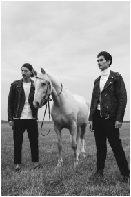 Two stylish men in leather jackets posing with a horse in a black and white fashion shoot.