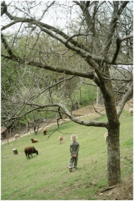A child stands under a leafless tree, watching sheep graze on a farm pasture.