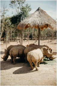 Group of wild rhinos grazing beneath a thatched shelter in a natural habitat.