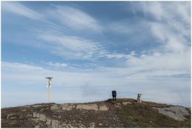 Two dogs on a rocky mountain peak under a dramatic sky with clouds.