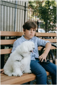 A young boy in a striped shirt sits with a fluffy white dog on a park bench.