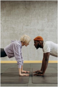Two adults face off in a plank exercise on gym mats, embodying fitness and diversity.