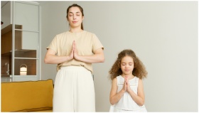 A mother and daughter practicing meditation and prayer indoors with eyes closed.