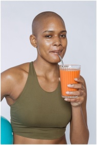African American woman in a sports bra drinking fresh carrot juice, symbolizing a healthy lifestyle.