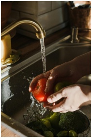 Close-up of hands washing a ripe tomato under a ki