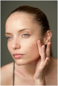 Close-up of a woman applying foundation, highlight
