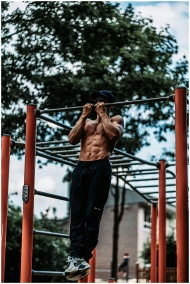 Athletic man performing pull-ups on a bar outdoors