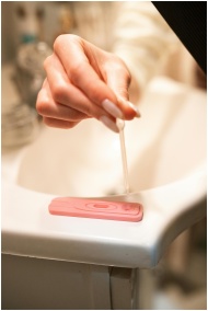 A hand using a pipette on a pregnancy test kit in a bathroom setting.