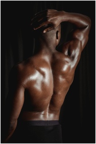 A muscular man flexes his back muscles posing shirtless. Indoor studio lighting enhances his physique.