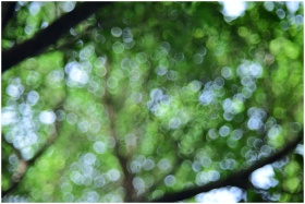 Beautiful abstract bokeh of sunlight filtering through lush green tree foliage, creating a dreamy pattern.