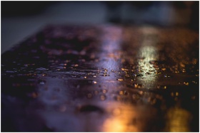 Dark, moody image of raindrops creating reflection